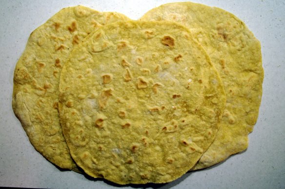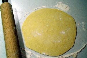 mischiato un po’ nella ciotola e poi ho continuato a lavorare sul tavolo dove avevo sparso un po’ di farina bianca. Ci vogliono pochissimi minuti e si ottiene un bell’impasto liscio e omogeneo. Ho fatto una specie di salame e diviso il tutto in 6 panetti. Sul tavolo spolverato di farina, ho steso ciascun panetto con le mani a formare la piadina (o se preferite con il mattarello) e cotto nella padella per le crèpes riscaldata senza olio per un paio di minuti per lato utilizzando una spatola per levare le bolle che si formavano.