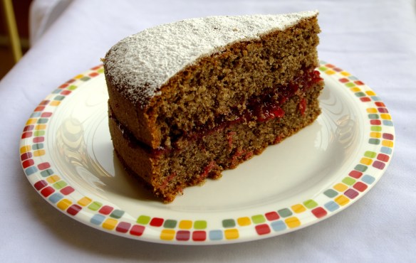 Quando la torta è diventata completamente fredda, l’ho tagliata in due e ho farcito con la marmellata di mirtilli rossi. Ho poi spolverizzato con abbondante zucchero a velo.