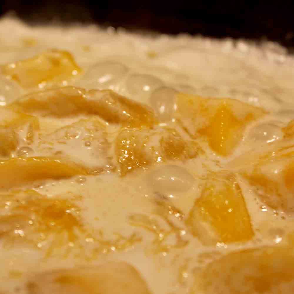 Nel mentre ho preparato la confettura di mango. Una volta pelato, pulito e ridotto in pezzetti l’ho messo – a fuoco medio – in una casseruola con lo zucchero di canna, lo zenzero fresco e il succo di un lime. Ho continuato a mescolare e dopo 15 minuti ho frullato con mixer a immersione e rimesso sul fuoco per un’altra mezz’ora, dopodiché